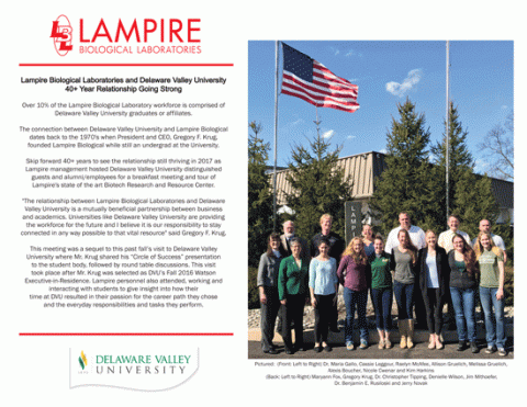 Skip forward 40+ years to see the relationship still thriving in 2017 as Lampire management hosted Delaware Valley University distinguished guests and alumni/employees for a breakfast meeting and tour of Lampire's state of the art Biotech Research and Resource Center.