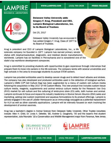 Krug is president and CEO of Lampire Biological Laboratories, Inc., a life sciences company he founded in 1977. Lampire has earned primary vendor status with biopharmaceutical, diagnostic, and medical device manufacturers worldwide. Lampire has six facilities in Pennsylvania and is considered one of the state’s top workforce development companies.