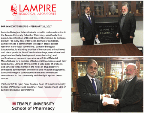 Lampire Biological Laboratories is proud to make a donation to the Temple University School of Pharmacy, specifically their project, Identification of Breast Cancer Biomarkers by Systems Biology. For every new order taken during our campaign, Lampire made a commitment to support breast cancer research in our local community.
